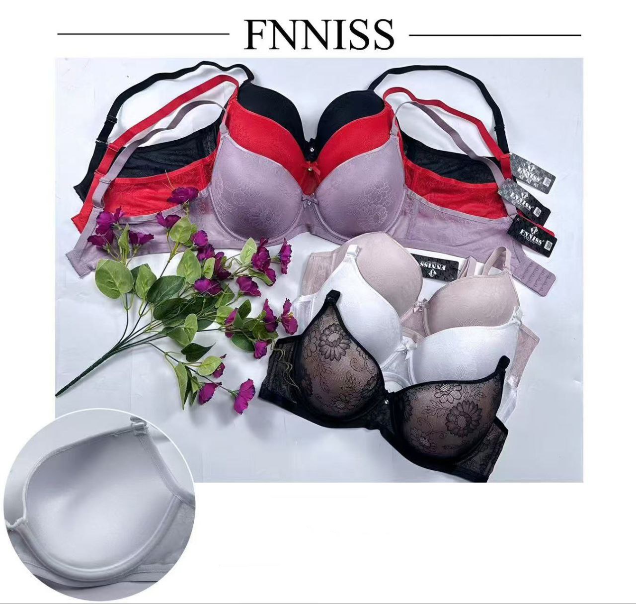 В упаковке три бюстгальтера одного цвета разных размеров.